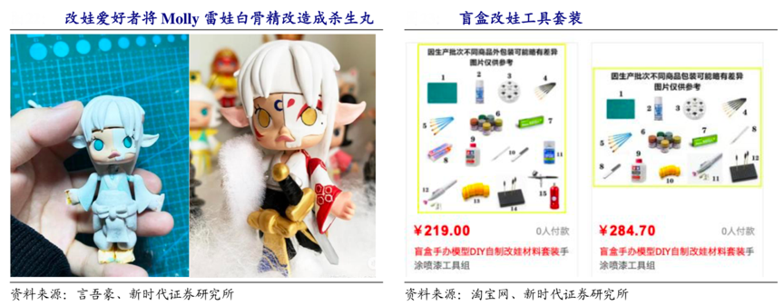 經(jīng)典案例:根據(jù)言吾豪、淘寶網(wǎng)、新時代證券研究所等綜合資訊表明,潮流玩具的改娃業(yè)務(wù)的發(fā)展進(jìn)一步拓展產(chǎn)業(yè)鏈。用戶在抽到雷款或者重復(fù)款時,除了二手交易 和換娃之外,還可以通過改娃獲得全新甚至獨一無二的形象。改娃是通過捏制、改 色和拼合,將玩偶改造成不同的形象。改娃的步驟通常為拆娃、塑型和上色,材料工具花費在 50-300 元之間。改娃的技術(shù)門檻較低且趣味性高,因此在盲盒玩家群 體中興起,甚至催生了職業(yè)改娃師。