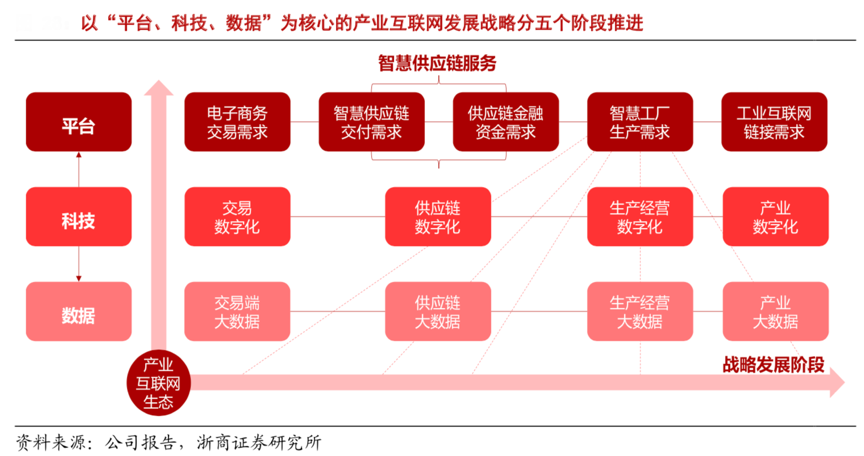 經(jīng)典案例:根據(jù)公司報(bào)告、浙商證券研究所等綜合資訊表明,國(guó)聯(lián)股份確定了以“平臺(tái)、科技、數(shù)據(jù)”為核心的產(chǎn)業(yè)互聯(lián)網(wǎng)發(fā)展戰(zhàn)略,將按五個(gè)階段依次推進(jìn)戰(zhàn)略:1工業(yè)電子商務(wù)階段,將滿(mǎn)足企業(yè)客戶(hù)的交易需求;2智慧供應(yīng)鏈階段,將滿(mǎn)足企業(yè)客戶(hù)的交付需求;3供應(yīng)鏈金融階段,將滿(mǎn)足企業(yè)客 戶(hù)的資金需求;4智慧工廠(chǎng)解決方案階段,將滿(mǎn)足企業(yè)客戶(hù)的生產(chǎn)需求;5工業(yè)互聯(lián)網(wǎng)階段,將上下游共構(gòu)鏈接,形成產(chǎn)業(yè)數(shù)字化閉環(huán)。