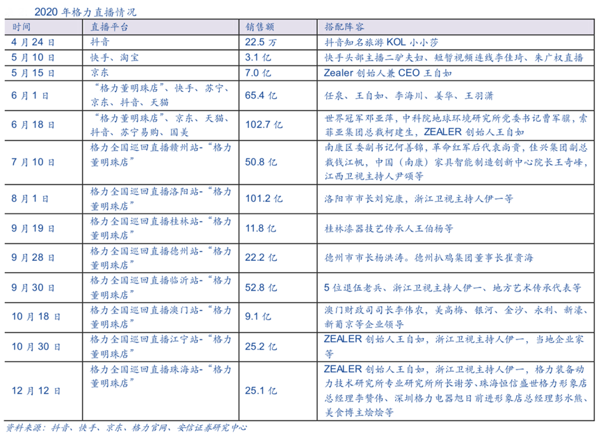 經(jīng)典案例:根據(jù)抖音、快手、京東、格力官網(wǎng)、安信證券研究中心等綜合資訊表明,7 月份以來,格力已開展 8 場全國巡回直播活動,累計銷售額達到 298.2 億元。近期的直播中,“格力董明珠店”不僅面向終端消費者,也向經(jīng)銷商開放了批貨的窗口,經(jīng)銷商從直播中下單提貨的型號,一般都是市場暢銷機型。