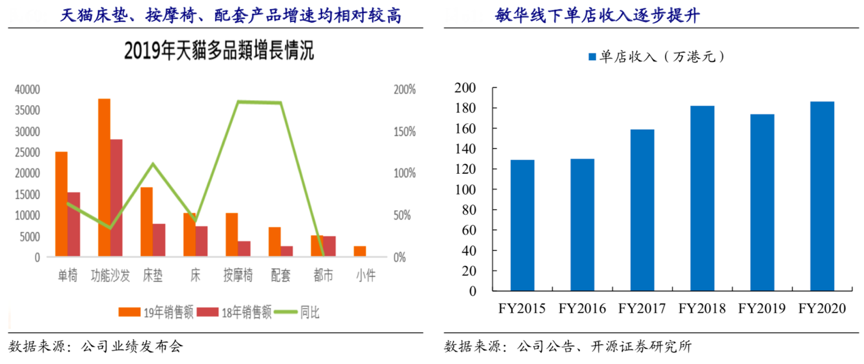 經(jīng)典案例:根據(jù)公司業(yè)績發(fā)布會、公司公告、開源證券研究所等綜合資訊表明,敏華控股品類拓展主要在于依靠沙發(fā)的前端引流作用,逐步帶動床墊、配套等產(chǎn)品銷售,進(jìn)而提升客單值。2019年,其天貓軟體品類中床墊、按摩椅、配套產(chǎn)品增速均相對較高,而消費(fèi)升級則主要為伴隨 消費(fèi)者消費(fèi)水平的持續(xù)提升,消費(fèi)者對于芝華士高價系列產(chǎn)品的接受度在不斷提高。