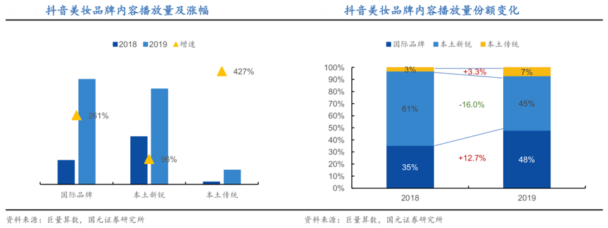 經(jīng)典案例:根據(jù)巨量算數(shù)、國元證券研究所等綜合資訊表明,2019 年,抖音美妝品牌年度關(guān)注量較 2018 年增長了 166%,其中國際品 牌與本土傳統(tǒng)品牌增長更明顯,內(nèi)容播放量同比增速分別達到 261%與 427%,份額分別提升 12.7%與 3.3%,本土新銳品牌經(jīng)歷了 2018 年爆發(fā)增長后基數(shù)較大,2019 年增速開始回歸,但也實現(xiàn)了+96%的快速增長。