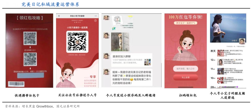 經(jīng)典案例:根據(jù)增長黑盒Growthbox、國元證券研究所等綜合資訊表明,完美日記通過產(chǎn)品附帶的二維碼作為流量入口,消費者在完美日記首次完成購買后會收到附帶的紅包卡,引導客戶關(guān)注完美日記公眾號和個人客服“小完子”,品牌方僅需花費 1-2 元紅包即可獲得一個公眾號粉絲、一個個人號好友、一個群成員。完美日記的個人號“小完子”是有獨立人設(shè)的美妝顧問,她的朋友圈會發(fā) 美妝教程、素顏自拍、產(chǎn)品圖片,同時為客戶解答疑問,分享優(yōu)惠。