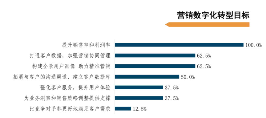 經典案例:根據《清華大學全球產業(yè)研究院-中國企業(yè)數(shù)字化轉型研究報告》等綜合資訊表明,企業(yè)營銷數(shù)字化的目標主要集中在提升銷售率和利潤率、打通客戶數(shù)據、加強營銷協(xié)同管理、構建全景用戶畫像、助力精準營銷等方面。數(shù)字化時代,更多企業(yè),尤其是面向個人消費者的制造業(yè)企業(yè)將營銷的中心轉移到如何與消費者建立更高頻的互動,讓消費者作為主體更多地參與到營銷價值的創(chuàng)造中來。同時,部分企業(yè)也更加重視通過營銷數(shù)字化為業(yè)務洞察和銷售策略調整提供支撐。