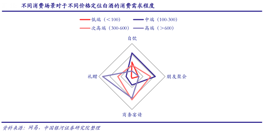 經(jīng)典案例:根據(jù)網(wǎng)易、中國銀河證券研究院等綜合資訊表明,朋友聚會(huì)中尚以中端和次高端為主,但在白酒的主要消費(fèi)場景 商務(wù)宴請和禮贈(zèng)中,高端產(chǎn)品才是消費(fèi)者的首選。根據(jù)馬斯洛需求層次理論,當(dāng)前白酒消費(fèi)更多的是匹配人們的社交需求以及自我尊重、自我實(shí)現(xiàn)需求,價(jià)格定位偏高的中高端白酒產(chǎn)品更適合商務(wù)宴請或是禮贈(zèng)等場合,體現(xiàn)參與主體的形象 身份等。