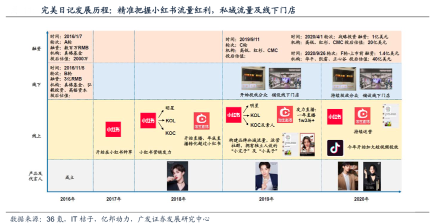 經(jīng)典案例:根據(jù)36氪、IT桔子、億邦動力、廣發(fā)證券發(fā)展研究中心等綜合資訊表明,完美日記的營銷路徑為:(1)前期小紅書密集種草,借助時尚圈以及粉圈 積累粉絲,通過明星為品牌帶流量;(2)中期小紅書持續(xù)種草,開始發(fā)力直播,同 時著重私域流量運(yùn)營;(3)后期持續(xù)運(yùn)營小紅書、直播以及社群,開始加快線下門店鋪設(shè),同時投放分眾樓宇廣告以擴(kuò)大品牌知名度。