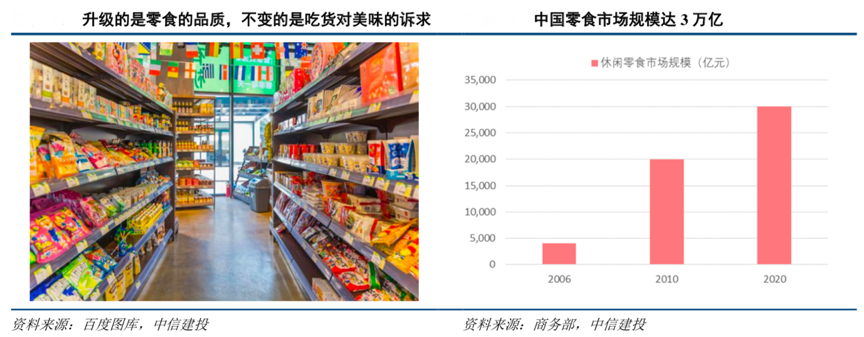 典型現(xiàn)象:根據(jù)百度圖庫、商務(wù)部、中信建投等綜合資訊表明,休閑零食的消費需求源于其為消費者帶來的美味滿足感:相較于一日三餐休閑食品不僅具有補充能量的作用,更起到減壓(鹵味、肉類)、保健(粗糧、堅果)、社交(辦公室零食)等功能。尤其是我國食用文化根基深厚、歷史悠久的鹵味食品,因其消費沖動型和食用成癮性的特點復(fù)購率極高,鹵制品細(xì)分市場近 兩年 CAGR 高達(dá) 16.5%。