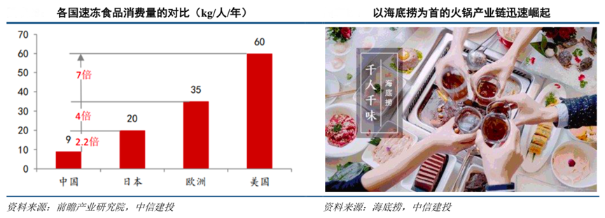 典型現(xiàn)象:根據(jù)前瞻產(chǎn)業(yè)研究院、海底撈、中信建投等綜合資訊表明,隨著居民外出就餐減少,為追求食品的便捷性,家庭消費速凍食品比例提升,自熱火鍋、半成品菜等新興食品出現(xiàn),同時,渠道用速凍食品、火鍋 底料需求快速爆發(fā)。目前中國餐飲連鎖占整體比重 5-10%,發(fā)達(dá)國家美國、日本超過 50%,國內(nèi)餐飲連鎖化趨 勢明顯。川菜、湘菜對食材要求不高,標(biāo)準(zhǔn)化、連鎖化優(yōu)勢明顯,尤其是火鍋產(chǎn)業(yè)鏈近年來發(fā)展迅猛。