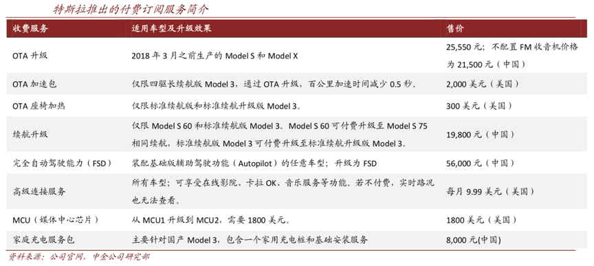 經(jīng)典案例:根據(jù)公司官網(wǎng)、中金公司研究部等綜合資訊表明,特斯拉 2019 年銷量約為 33 萬輛,截至 2019 年全球保有量約 77 萬輛,隨著產(chǎn)銷量不斷爬坡,保有量持續(xù)上漲, 特斯拉推出了一系列付費(fèi)升級(jí)及付費(fèi)訂閱服務(wù),收入來源從主要由“新車貢獻(xiàn)”逐漸轉(zhuǎn)向“增量+保有量”共同貢獻(xiàn)。