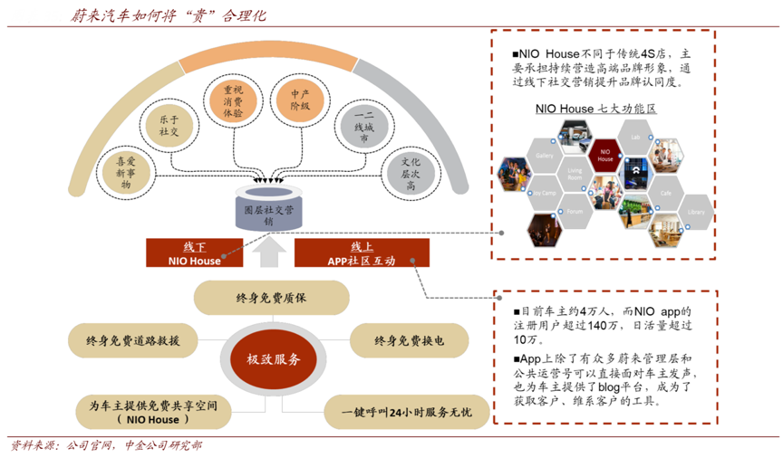 經(jīng)典案例:根據(jù)公司官網(wǎng)、中金公司研究部等綜合資訊表明,蔚來汽車并沒有直接降價(jià)來解決貴的問題,而是通過提供極致服務(wù)、圈層營(yíng)銷,使“貴”合理化。一方面,蔚來提供全面、極致的售后服 務(wù)體驗(yàn),包括終身免費(fèi)道路救援、終身免費(fèi)質(zhì)保、終身免費(fèi)道路換電、免費(fèi)共享空間等; 另一方面,線下 NIO House 和線上 APP 社區(qū)齊發(fā)力,利用圈層社交營(yíng)銷,提升品牌認(rèn)可度,塑造高端形象,使“貴”合理化。