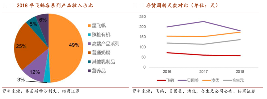 經(jīng)典案例:根據(jù)弗若斯特沙利文、飛鶴、貝因美、澳優(yōu)、合生元公司公告、招商證券等綜合資訊表明,飛鶴靠大單品、強(qiáng)周轉(zhuǎn)模式,突圍奶粉行業(yè)。其產(chǎn)品中超高端星飛帆占比 50%,高端超高端產(chǎn)品占比 75%,通過高舉高打 的模式實(shí)現(xiàn)了快速擴(kuò)張。飛鶴存貨周轉(zhuǎn)速度是內(nèi)資龍頭品牌中最快的,存貨周轉(zhuǎn)天數(shù)最 近三年不斷下降,2018 年僅有 57 天。