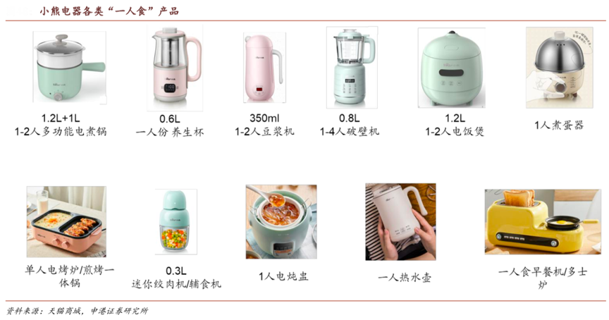 經(jīng)典案例:根據(jù)天貓商城、申港證券研究所等綜合資訊表明,小熊針對單身場景進行新品開發(fā),現(xiàn)有“一人食”產(chǎn)品包括了電煮鍋、電飯煲、 養(yǎng)生杯、豆?jié){機、破壁機、煮蛋器、電烤爐、絞肉機、電燉盅、熱水壺、多士爐等眾多家電產(chǎn)品,健全的產(chǎn)品布局印證了公司在年輕化需求挖掘上的多年深耕。