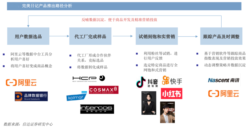 經(jīng)典案例:根據(jù)信達(dá)證券研發(fā)中心等綜合資訊表明,完美日記以消費者大數(shù)據(jù)洞察為基礎(chǔ),通過精準(zhǔn)算法及前瞻判斷力選品,利用全球優(yōu)質(zhì)的供應(yīng)鏈完成數(shù)據(jù)到商品的轉(zhuǎn)化,從試銷到全渠道飽和式營銷打造產(chǎn)品,通過各類數(shù)據(jù)系統(tǒng)檢測營銷投放效果及用戶動態(tài)變化,及時調(diào)整策略,同時沉淀消費者行為數(shù)據(jù)為其他產(chǎn)品推廣提供依據(jù)。