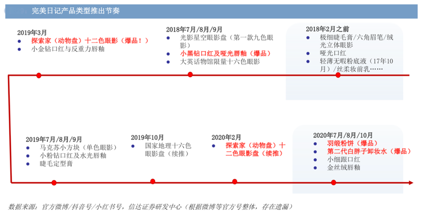 經(jīng)典案例:根據(jù)官方微博/抖音號/小紅書號、信達(dá)證券研發(fā)中心等綜合資訊表明,2018年下半年到2019年,完美日記對眼妝中眼影及唇妝中口紅唇釉重點品類集中大規(guī)模推廣,打造出十二色眼影盤、啞光唇釉、小黑鉆口紅等爆款產(chǎn)品,引領(lǐng)彩妝潮流;2020年在維持眼妝、唇妝優(yōu)勢后,大力推廣面部底妝及卸妝子類目,羽緞蜜粉、白胖子卸妝水等產(chǎn)品成為爆款產(chǎn)品。