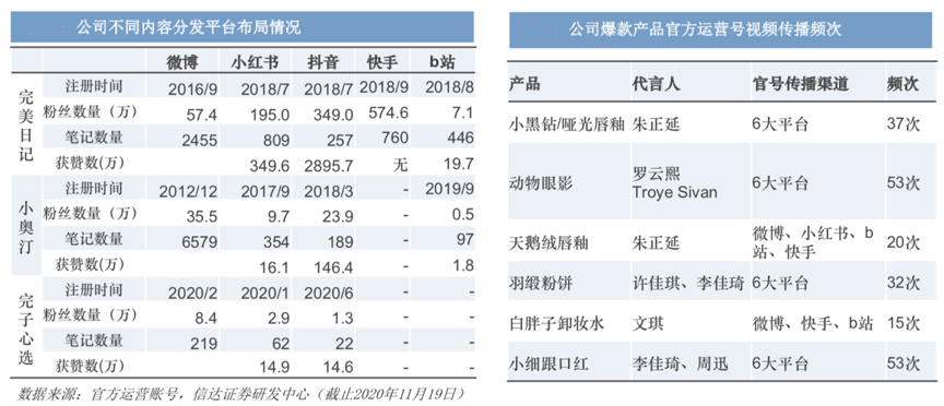 經(jīng)典案例:根據(jù)官方運營帳號、信達(dá)證券研發(fā)中心等綜合資訊表明,完美日記依托海量KOL全渠道飽和式內(nèi)容分發(fā),以爆款產(chǎn)品動物眼影為例,產(chǎn)品推出后利用微博、抖快等6大社交平臺進行推廣,官方號以羅云熙、Troye Sivan宣傳片為主,傳播頻次超過50次,同時利用KOL視頻教學(xué)推廣等模式迅速推廣,例如抖快手達(dá)人視頻超50條,占領(lǐng)用戶心智。目前完美日記在6大社交平臺 擁有上千萬粉絲。