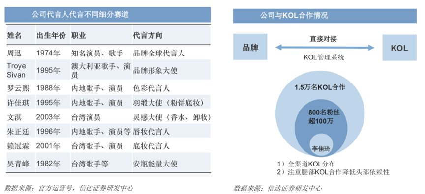 經(jīng)典案例:根據(jù)官方運營號、信達(dá)證券研發(fā)中心等綜合資訊表明,完美日記先后與8位明星合作,各代言人分工明晰,例如早期設(shè)立專門的色彩代言人、底妝代言人,近期加設(shè)品牌形象大使及全球代言人,強化品牌調(diào)性。同時注重與腰部KOL合作,擁有800名百萬以上粉絲量的KOL,降低頭部的依賴性。