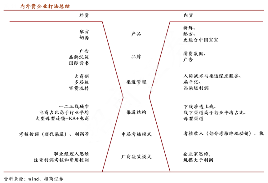 經(jīng)典案例:根據(jù)wind、招商證券等綜合資訊表明,外資優(yōu)勢在于——“品牌”,品牌的基礎(chǔ)是依托海外奶源的信任感、以及進(jìn)入中國以來廣宣帶來的知名度,問題在于渠道 無法下沉、也并不能完全適應(yīng)(中小型)母嬰店打法。內(nèi)資大部分品牌,優(yōu)勢在于能在 下線城市組織渠道服務(wù),但是問題在于安全性上不受充分信任,品牌力無法提升,因此在較為透明的現(xiàn)代渠道和大型連鎖,很難有 PK 外資的話語權(quán)。