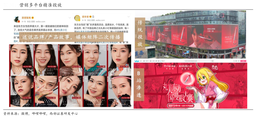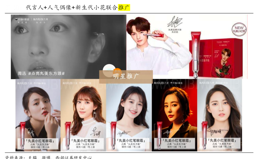 經(jīng)典案例:根據(jù)天貓、微博、西部證券研發(fā)中心等綜合資訊表明,丸美由代言人周迅發(fā)起#點(diǎn)亮丸美東方眼#話題,并邀請(qǐng)人氣偶像朱正廷擔(dān)任品牌大使,同時(shí)聯(lián)合吳倩、李藝彤、孫怡、李純、 陳鈺琪五位新生代小花炒熱話題,共同推廣新品“小紅筆”。 同時(shí)聯(lián)手各類(lèi)美妝博主、時(shí)尚達(dá)人等 KOL 和 KOC,通過(guò)抖音、B 站、微博、小紅書(shū)等多個(gè)社媒平臺(tái)發(fā)布好物分享、產(chǎn)品測(cè)評(píng)、種草筆記等營(yíng)銷(xiāo)內(nèi)容,帶出“小紅筆”的用法、成分和功效,助力產(chǎn)品出圈。