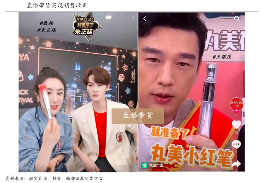 經(jīng)典案例:根據(jù)淘寶直播、抖音、西部證券研發(fā)中心等綜合資訊表明,丸美邀請(qǐng)王耀慶、張?jiān)讫埖让餍窃诙兑暨M(jìn)行直播引流,并通過(guò)入駐頭部主播薇婭、雪梨直播間為“小紅筆”直播帶貨。據(jù)相關(guān)資料統(tǒng)計(jì),截至 2020 年 11 月13 日,“小紅筆”累計(jì)銷(xiāo)售 17 萬(wàn)+件。