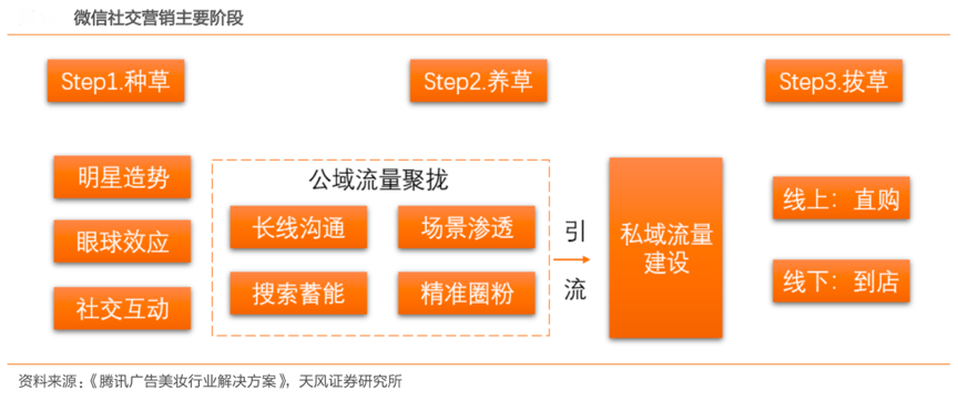 經(jīng)典案例:根據(jù)《騰訊廣告美妝行業(yè)解決方案》、天風(fēng)證券研究所等綜合資訊表明,微信私域?qū)Я骱蜕缃绘溌凡粩嘌由?,種草、養(yǎng)草和拔草三階段構(gòu)建品牌運(yùn)營閉環(huán)。以微信為例,種草階段,微信通過明星朋友圈、首條評論互動形式實現(xiàn)與用戶的“親密互動”,激發(fā)用戶關(guān)注;養(yǎng)草階段通過公域引流,包括朋友圈+公眾號廣告組合投放,“搜一搜”關(guān)鍵詞進(jìn)行精準(zhǔn)定位,私域建設(shè)上通過企業(yè)微信、小程序進(jìn)一步培養(yǎng)用戶心智;拔草階段通過線上直購和線下到店等模式構(gòu)建美妝社交全鏈路閉環(huán)。