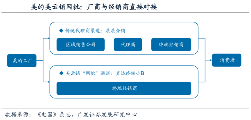 經(jīng)典案例:根據(jù)《電器》雜志、廣發(fā)證券發(fā)展研究中心等綜合資訊表明,2017年美的渠道層級由“美的-銷售公司-代理商-二級經(jīng)銷商-終端零售商”轉(zhuǎn)變?yōu)?ldquo;美的-商務(wù)中心-代理商(向運營商轉(zhuǎn)變)-終端零售商”。同時其設(shè)立美云銷平臺,實現(xiàn)廠家與經(jīng)銷商直接對接。傳統(tǒng)的代理分銷渠道體系下,渠道流通需經(jīng)歷“廠商-銷售公司-代理商-終端經(jīng)銷商”等層層環(huán)節(jié),而美的網(wǎng)批模式則實現(xiàn)了工廠直供經(jīng)銷商門店,“廠商-終端經(jīng)銷商”直接對接。