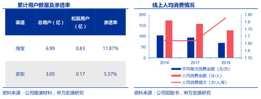 經(jīng)典案例:根據(jù)公司路演材料、公司招股書、申萬宏源研究等綜合資訊表明,截至 2019 H1,三只松鼠公司在淘寶平臺累計(jì)用戶為 0.83 億人次,滲透率為 11.87%,在京東平臺累計(jì)用戶為 0.17 人次, 滲透率為 5.57%。2018 年,公司線上用戶人均購買頻次為 1.83 次/年,平均單次消費(fèi)金額為 69.59 元。16-18 年,隨著線上品類布局更加豐富,復(fù)購率更高的烘焙類等產(chǎn)品發(fā)力,帶動購買頻次總體呈上升趨勢。