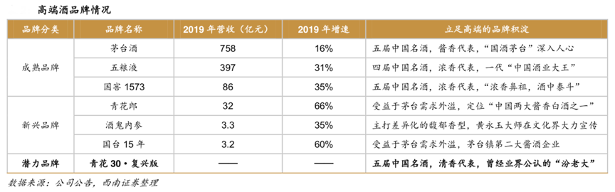 經(jīng)典案例:根據(jù)公司公告、各品牌官網(wǎng)、西南證券等綜合資訊表明,茅臺、五糧液、瀘州老窖均多次蟬聯(lián)中國名酒,曾多年問鼎過行業(yè)一哥,同時受益于醬香熱疊加茅臺供給不足,醬酒中品牌力較為優(yōu)秀的青花郎和國臺 15 年借機向高端發(fā)力;此外酒鬼內(nèi)參具有馥郁香型的差異化產(chǎn)品特點,早年黃永玉大師在文化圈的宣傳奠定了較高的品牌格調(diào),這三個新銳品牌近幾年均增長勢頭迅猛。
