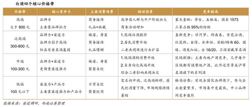 經(jīng)典案例:根據(jù)渠道調(diào)研、各品牌官網(wǎng)、西南證券等綜合資訊表明,居民收入水平高低各異疊加不同場景中消費屬性差異較大,白酒得以形成上至超 3000 元,下至 10 多元的寬闊價格帶。目前,白酒行業(yè)可劃分為高端、次高端、中端、低端四個核心價格帶,各價格帶的核心競爭力和驅(qū)動因素差異明顯,均有自身內(nèi)在的發(fā)展邏輯和細(xì)分。