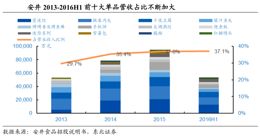 同時根據(jù)安井食品招股說明書、東北證券等綜合資訊表明,安井順應(yīng)家庭端火鍋料 消費的高端化所推出的單品“鎖鮮裝”和“三大丸”,順利搶占行業(yè)制高點,2020 年上半年新品鎖 鮮裝系列大規(guī)模放量促進公司魚糜制品收入較上年同期增長 30.31%,2013-2016 年 安井大單品銷售增長對營業(yè)收入增長的貢獻達到 50%。