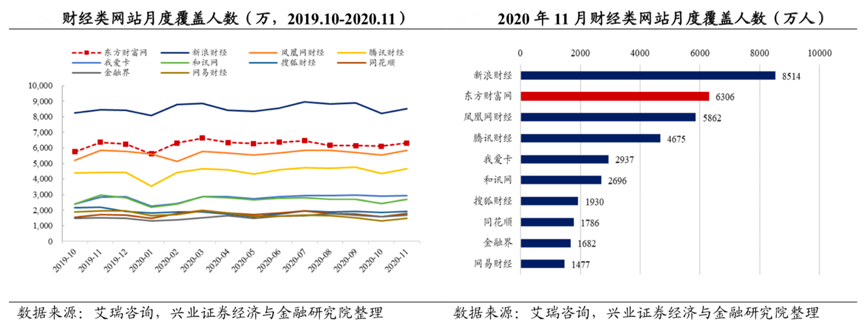 經(jīng)典案例:根據(jù)艾瑞咨詢、興業(yè)證券經(jīng)濟(jì)與金融研究院等綜合資訊表明,2012-2017 年,東方財富網(wǎng)的月度覆蓋人數(shù)穩(wěn)居行業(yè) Top2,其中 2015 年 3 月起資本市場大幅走強(qiáng),東方財富網(wǎng)月度覆蓋人數(shù)一度超越 1 億人次,同時2020 年 11 月,東方財富網(wǎng)月度覆蓋人數(shù)達(dá) 6306 萬人,僅次于新浪財經(jīng),持續(xù)領(lǐng)先鳳 凰財經(jīng)、騰訊財經(jīng)、和訊、同花順等財經(jīng)網(wǎng)站。