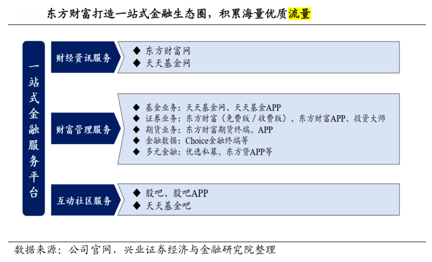 經(jīng)典案例:根據(jù)公司官網(wǎng)、興業(yè)證券經(jīng)濟(jì)與金融研究院等綜合資訊表明,東方財富深耕互聯(lián)網(wǎng)財經(jīng)資訊場景,打造出以“東方財富網(wǎng)”為核心,疊加“天天基金網(wǎng)+股吧”等多樣化場景賦能的一站式金融服務(wù)平臺,形成了集“財經(jīng)資訊服務(wù)+財富管理服務(wù) +互動社區(qū)服務(wù)”的金融生態(tài)圈,完成了海量財經(jīng)屬性流量的原始積累,并形成對金融投資人群的用戶粘性,為日后轉(zhuǎn)型發(fā)展奠定了堅實的基礎(chǔ)。