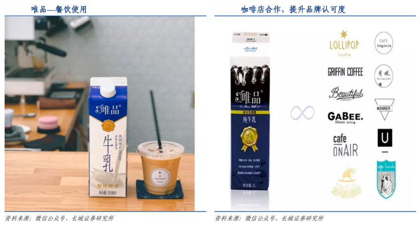 經(jīng)典案例:根據(jù)微信公眾號(hào)、長(zhǎng)城證券研究所等綜合資訊表明,唯品餐飲使用牛奶目前和多家咖啡店合作,聚焦高端消費(fèi)群體。在相關(guān)測(cè)評(píng)中,使用唯品牛奶后的咖啡,奶泡綿密度、打發(fā)后甜感、奶泡維持度、奶咖口感方面均較為突出。而消費(fèi)人群高度重合,這部分精品咖啡店用戶和飲用導(dǎo)流,提升了品牌信賴度及認(rèn)可度。