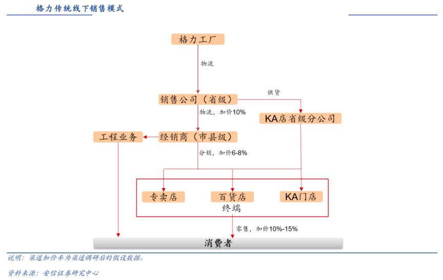 經(jīng)典案例:根據(jù)公司官網(wǎng)、安信證券研究中心等綜合資訊表明,格力傳統(tǒng)的線下渠道中,銷售公司和中間經(jīng)銷商的職能為負責區(qū)域銷售推廣和物流倉儲工作,其利潤來源為批發(fā)貨物賺取價差。