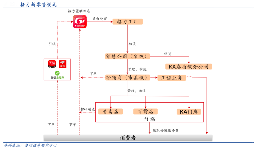 經(jīng)典案例:根據(jù)公司官網(wǎng)、安信證券研究中心等綜合資訊表明,“格力董明珠店”實質(zhì)上是格力對網(wǎng)批系統(tǒng)的探索,其對終端消費者和經(jīng)銷商都開放了下單窗口。通過推進渠道扁平化建設,構(gòu)建總部和各地分銷商的直接聯(lián)系,格力將弱化銷售公司和代理商的職能,消減渠道中間層級,減少渠道冗余費用,從而提高渠道效率,并且探索促成線上和線下的融合。