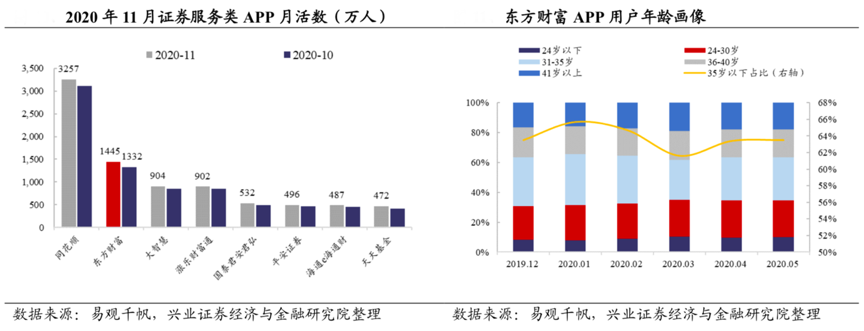經(jīng)典案例:根據(jù)易觀千帆、興業(yè)證券經(jīng)濟(jì)與金融研究院等綜合資訊表明,東方財(cái)富 APP 人均單日訪問(wèn)時(shí)長(zhǎng)由2017 年的約 30 分鐘顯著提升至當(dāng)前的近 70 分鐘,其不斷加強(qiáng)產(chǎn)品創(chuàng)新研發(fā),持續(xù)提升用戶體驗(yàn)和市場(chǎng)占有率。從用戶畫(huà)像來(lái)看,東財(cái) APP 聚焦中青年用戶,35 歲以下占比維持 65%左右。截至 2020 年 5 月,東 財(cái) APP 用戶 24 歲以下占比 9.9%,24-30 歲占比 24.8%,31-35 歲占比 28.8%,35 歲合計(jì)占比 63.5%。