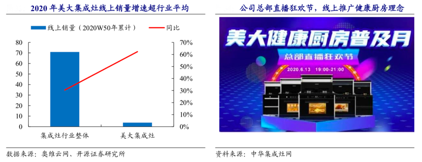 經(jīng)典案例:根據(jù)奧維云網(wǎng)、中華集成灶網(wǎng)、開源證券研究所等綜合資訊表明,2020年美大集成灶公司授權(quán)線下經(jīng)銷商開設(shè)線上專賣店,并加大對新媒體渠道微博、抖音、快手等的投入,通過直播帶貨提高消費者認(rèn)知度,增加線上銷量。根據(jù)奧維云網(wǎng)數(shù)據(jù),截至 2020W50,美大集成灶線上銷量年累計達(dá) 3.83 萬臺,同比增長 62.29%,較行業(yè)整體線上銷量增速超出 31.87pct,電商渠道建設(shè)效果較為亮眼。