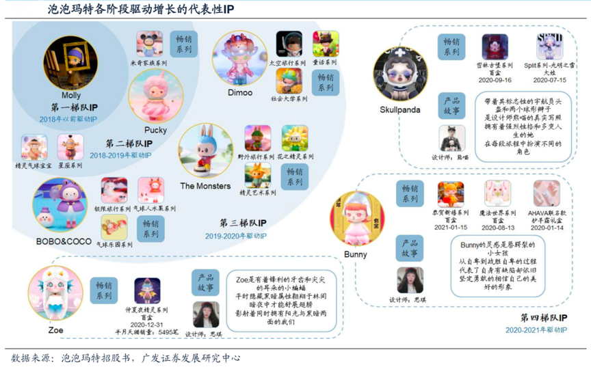 經(jīng)典案例:根據(jù)泡泡瑪特招股書、廣發(fā)證券發(fā)展研究中心等綜合資訊表明,2020H1泡泡瑪特的盲盒整體銷售額依然實現(xiàn)了大幅正增長,同增71.16%。其中,Dimmo憑借2020年3月、5月發(fā)售的“太空旅行系列”和“童話系列”,上半年銷售收入達到1.17億元,超過去年全年水平,成為第三大銷售額的IP;Pucky的銷售收入同增68.9%,The Monsters在代表人物L(fēng)abubu的“花之精 靈系列”的推動下,銷售收入同增154.3%。Bunny、Skullpanda、Zoe暗夜精靈等新自有IP蓄勢待發(fā),以“發(fā)售即爆款”的速度接力經(jīng)典產(chǎn)品。