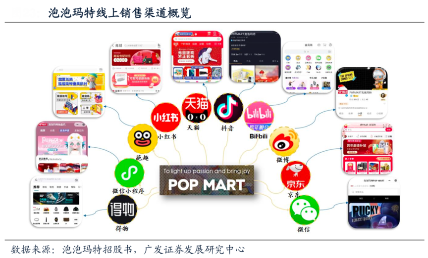 經(jīng)典案例:根據(jù)泡泡瑪特招股書、廣發(fā)證券發(fā)展研究中心等綜合資訊表明,從2016年6月入駐天貓至今,泡泡瑪特已全面覆蓋了綜合電商、社交電商,抽盒機小程序,短視頻和直播平臺以及垂類社區(qū)等年輕人可能使用的各類APP??煞譃樽杂星篮偷谌角溃罢甙ㄝ馊PP、抽盒機微信小程序、泡泡瑪特微信官方商城,后者包括泡泡瑪特天貓旗艦店、泡泡瑪特京東旗艦店和小紅書等。線上銷售收入占比已從2016 年4.0%迅速提升至2020上半年的40%。