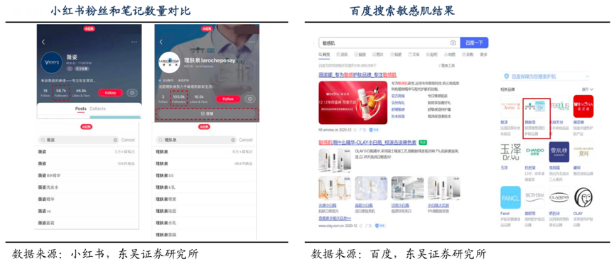 經(jīng)典案例:根據(jù)小紅書、百度、東吳證券研究所等綜合資訊表明,在種草平臺(tái)小紅書上,薇姿官方賬號(hào)粉絲 5.8 萬(wàn),相關(guān)筆記 3 萬(wàn)多篇,同比理膚泉粉絲達(dá) 10 萬(wàn),相關(guān)筆記大于 9 萬(wàn)篇。在百度搜索敏感肌、噴霧、藥妝,相關(guān)推薦里理膚泉有50+條。