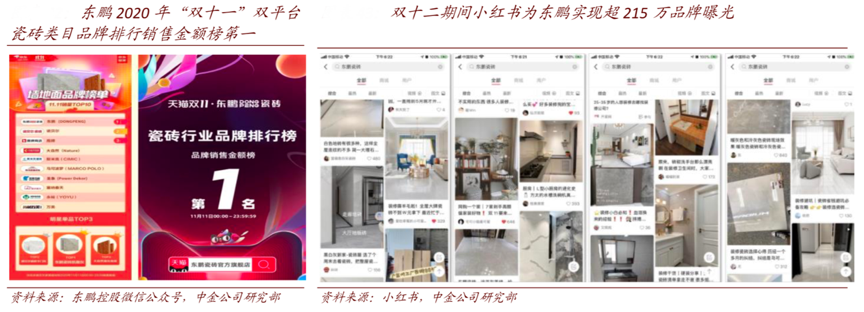 經(jīng)典案例:根據(jù)東鵬控投微信公眾號、小紅書、中金公司研究部等綜合資訊表明,2020 年雙十一東鵬再次斬獲天貓、京東雙平臺瓷磚類目品牌排行銷售金額榜第一。2020 年緊跟天貓平臺“輕店”、“同 城購”玩法,開通了 127 個城市的同城購,上線 1033 家輕店,通過“本地活動+極致產(chǎn)品+特色服務(wù)”,實現(xiàn)對本地化潛在客戶的精準(zhǔn)匹配。2020年雙十二期間再次加強線上客戶精準(zhǔn)觸達,線上引流為線下精準(zhǔn)派單超 1 萬筆,為終端經(jīng)銷商 強勢賦能。