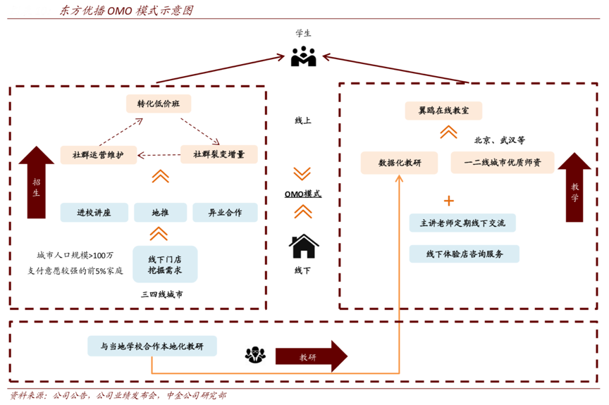 經(jīng)典案例:根據(jù)公司公告、公司業(yè)績發(fā)布會(huì)、中金公司研究部等綜合資訊表明,東方優(yōu)播通過地推、進(jìn)校講座、異業(yè)合作等線下方式接觸當(dāng)?shù)厣?,進(jìn)行低成本引流,繼而通過在線低價(jià)課將線下流量導(dǎo)入線上。在線上社群深度運(yùn)營中進(jìn)行用戶篩選和維護(hù),提高正課轉(zhuǎn)化率,同時(shí)社群裂變也可以進(jìn)一步擴(kuò)大增量,形成線上招生渠道的自循環(huán)。