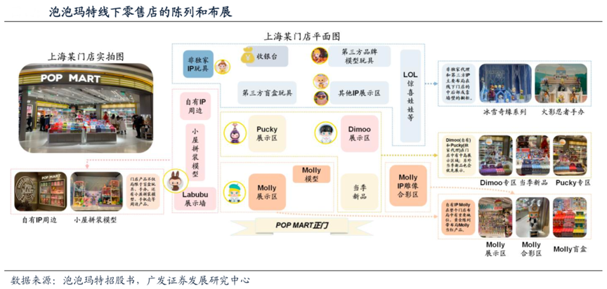 經(jīng)典案例:根據(jù)泡泡瑪特招股書、廣發(fā)證券發(fā)展研究中心等綜合資訊表明,泡泡瑪特線下實體門店裝修風(fēng)格潮流,環(huán)形設(shè)計、玩具展示墻和門口的Molly模型的共同烘托出店面的品牌感,合照區(qū)增強了與消費者的互動,快節(jié)奏的背景音樂動感旋律與潮玩文化相得益彰。泡泡瑪特的門店客服訓(xùn)練有素,對產(chǎn)品理解充分,引導(dǎo)顧客完成消費轉(zhuǎn)化。