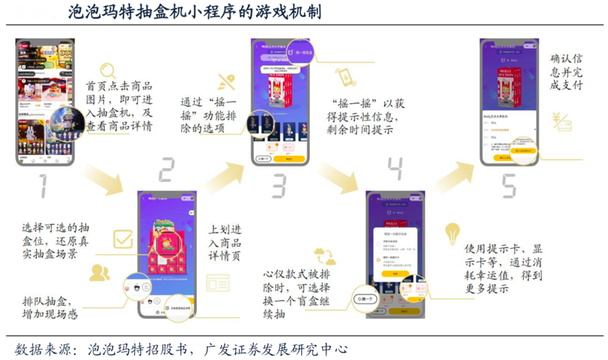 經(jīng)典案例:根據(jù)泡泡瑪特招股書、廣發(fā)證券發(fā)展研究中心等綜合資訊表明,泡泡瑪特2018年9月推出微信抽盒機,將傳統(tǒng)的商品圖示頁替換成互動玩法抽盒機,用戶可直接從微信小程序中進入選盒界面,下拉則可以瀏覽商品詳情。虛擬抽盒機設(shè)置了挑選抽盒位(在一套盲盒中挑選一個)、排隊(多個人同抽一套盲盒時需要排隊)、搖一搖(做初步信息排除) 等以還原真實抽盒場景,另外,為了增加抽盒游戲性,增加了提示卡(增加一條盲盒 商品提示信息)、顯示卡(直接顯示所抽盲盒)等輔助道具,用戶需要完成日常任務(wù)獲得功能道具或幸運值,再通過幸運值兌換相關(guān)卡券。由于抽盒機游戲道具設(shè)置,以及線上換盒的便利性,更容易引發(fā)用戶為獲得高價值“隱藏款”的消費沖動,提升復(fù)購率。