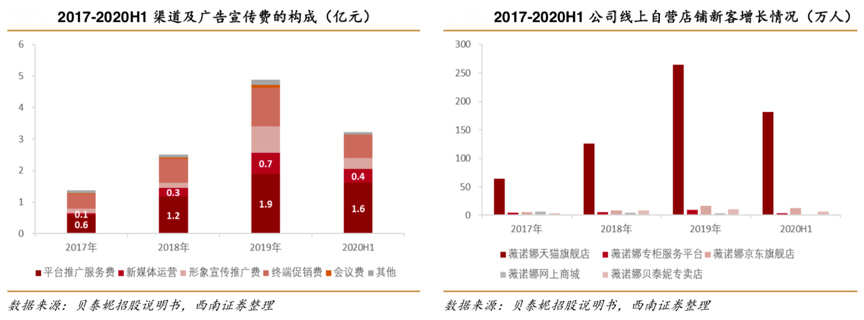 經(jīng)典案例:根據(jù)貝泰妮招股說明書、西南證券等綜合表明,自 2018 年以來,貝泰妮公司通過在微博、微信公眾號(hào)、小紅書、抖音、知乎等新興媒體上憑借 KOL 種草、公眾號(hào)文章、網(wǎng)絡(luò)直播、短視頻等各類方式進(jìn)行產(chǎn)品內(nèi)容營(yíng)銷推廣,多渠道、多層次覆蓋目標(biāo)消費(fèi)者群體。2020H1,其新媒體運(yùn)營(yíng)費(fèi)用為 0.4 億元,在營(yíng)收中占比為9.1%。