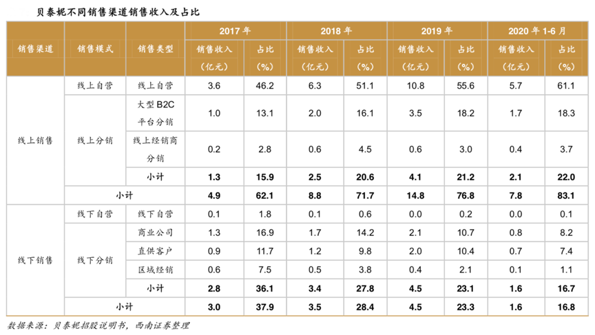 經(jīng)典案例:根據(jù)貝泰妮招股說明書、西南證券等綜合表明,從銷售模式來看,貝泰妮主要通過線下和線上兩種渠道對(duì)外銷售。其中其線下銷售主要通過商業(yè)公司、直供客戶以及區(qū)域經(jīng)銷對(duì)外銷售,線上銷售主要包括線上直營(yíng)和大型 B2C 平臺(tái)分銷。2017-2019 年,其線上銷售占比從 62.1%上漲至 76.8%。2020H1,其線上銷售 規(guī)模為 7.8 億元,銷售占比為 83.2%。
