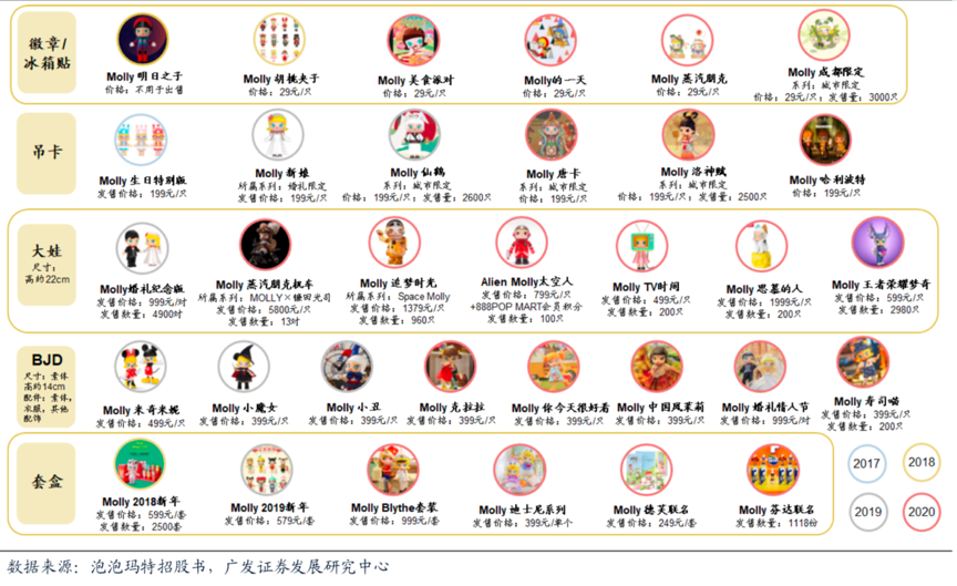 經(jīng)典案例:根據(jù)泡泡瑪特招股書、廣發(fā)證券發(fā)展研究中心等綜合資訊表明,2020年Molly與德芙、芬達、娃哈哈的合作,在套裝的任意隔盒中放入Molly盲盒玩偶等方式進行推廣普及,擴大IP影響力。2019年Molly的非盲盒類產(chǎn)品的銷售收入已達到6748萬元,同比增長118.4%。