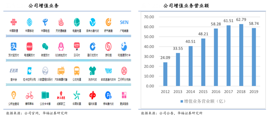 經(jīng)典案例:根據(jù)公司官網(wǎng)、大眾點評、華福證券研究所等綜合資訊表明,紅旗連鎖公司通過提供靈活豐富的增值服務(wù),主要涵蓋代收費服務(wù)、快遞代收代派、充值、信用卡還款等項目。其多數(shù)增值服務(wù)執(zhí)行傭金制度,且不存在額外的成本,所以所獲傭金收入相當(dāng)于直接計入利潤。2012 年至 2019 年,公司增值業(yè)務(wù)營業(yè)額由 24.09 億元提高至 58.74 億元,CAGR 為 14%。