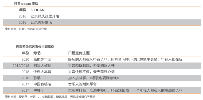 經(jīng)典案例:根據(jù)愛奇藝、芒果TV、優(yōu)酷視頻、天風證券研究所等綜合資訊表明,抖音 Slogan 最開始為“讓崇拜從這里開始”,主打“崇拜”和“美好”,隨著用戶不斷增 長,Slogan 轉(zhuǎn)變?yōu)?ldquo;記錄美好生活”,2018 年,抖音品牌全面升級。核心圈層的影響力慢慢擴張,更多普通人的表達訴求也被激發(fā), Slogan 升級成為“記錄美好生活”,放寬了用戶圈層和內(nèi)容領(lǐng)域,瞄準了更大的市場,但依舊以“美好”作為抖音的宣傳主題。