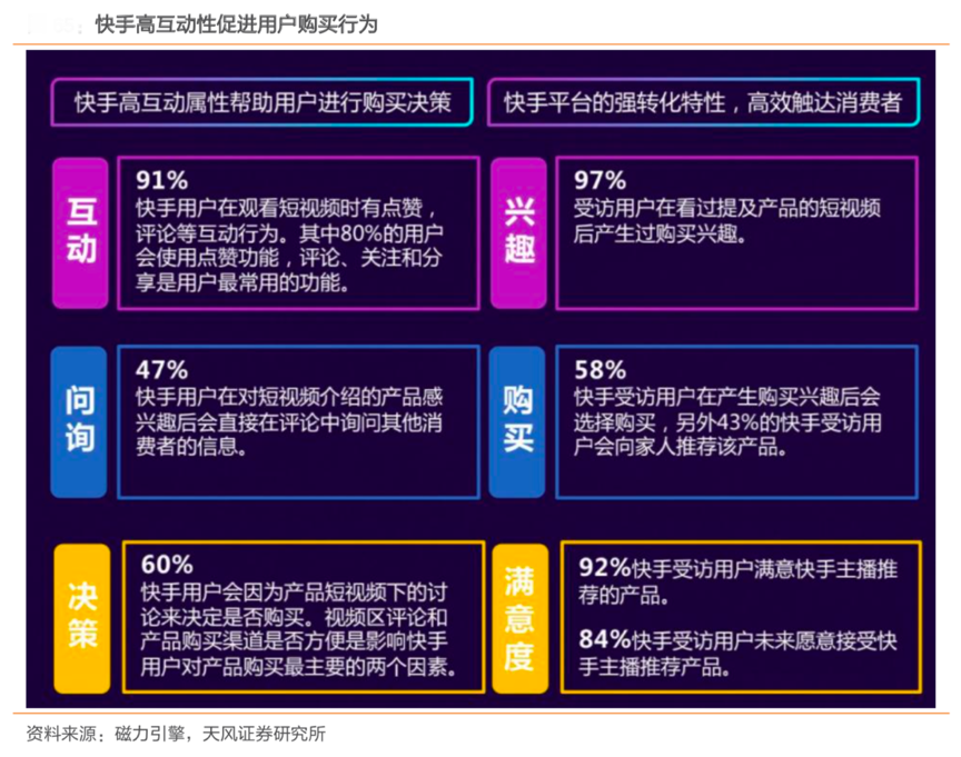 經(jīng)典案例:根據(jù)磁力引擎、天風證券研究所等綜合資訊表明,結(jié)合《快手電商營銷價值報告》等數(shù)據(jù)顯示,32%的快手用戶會因為信任主播的推薦而購買 產(chǎn)品,12%用戶單純?yōu)橹С种鞑ザ徺I產(chǎn)品,可見快手用戶對主播信任程度高。同時,根據(jù)磁力引擎,有 60%的用戶是由于視頻網(wǎng)友討論決定是否購買,快手主播與粉絲的互動在直播帶貨中發(fā)揮著至關(guān)重要的作用,92%的用戶表示滿意主播推薦的商品。