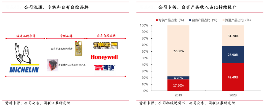 經(jīng)典案例:根據(jù)公司公告、公司招股說明書、國聯(lián)證券研究所等綜合資訊表明,途虎公司專供、自有品牌占比持續(xù)提升,公司在低線城市推自有品牌更加便捷。截至 2023Q1,途虎推出了 51 個自有品牌并于過去 12 個月通過途虎平臺交易了 7429 個 SKU。