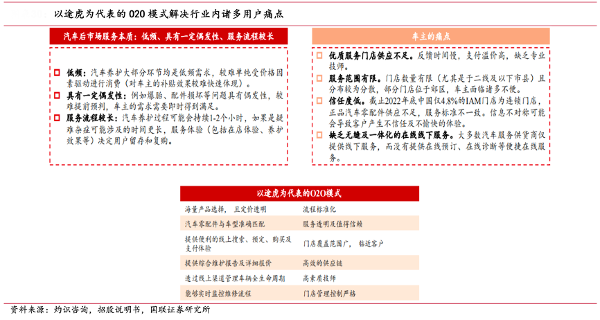 經(jīng)典案例:根據(jù)灼識咨詢、招股說明書、國聯(lián)證券研究所等綜合資訊表明,以途虎為代表的 O2O 模式解決汽車后市場諸多用戶痛點。O2O 汽車服務(wù)模式將線 上平臺及線下門店的優(yōu)點相結(jié)合,線上平臺為線下運營提供龐大的客戶流量及數(shù)據(jù) 分析;線下門店與集中式供應(yīng)鏈系統(tǒng)合作,采用統(tǒng)一的數(shù)字化客戶管理及訂單系統(tǒng), 并且線下門店受到平臺的實時嚴格管控。